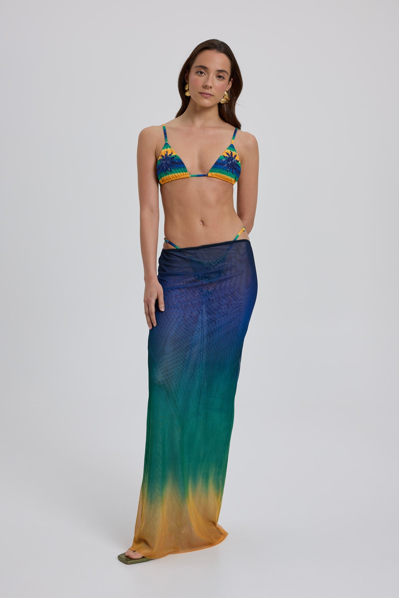 Skirt with elastic waistband. Inner lining combined with semi-sheer fabric. Back slit detail.
