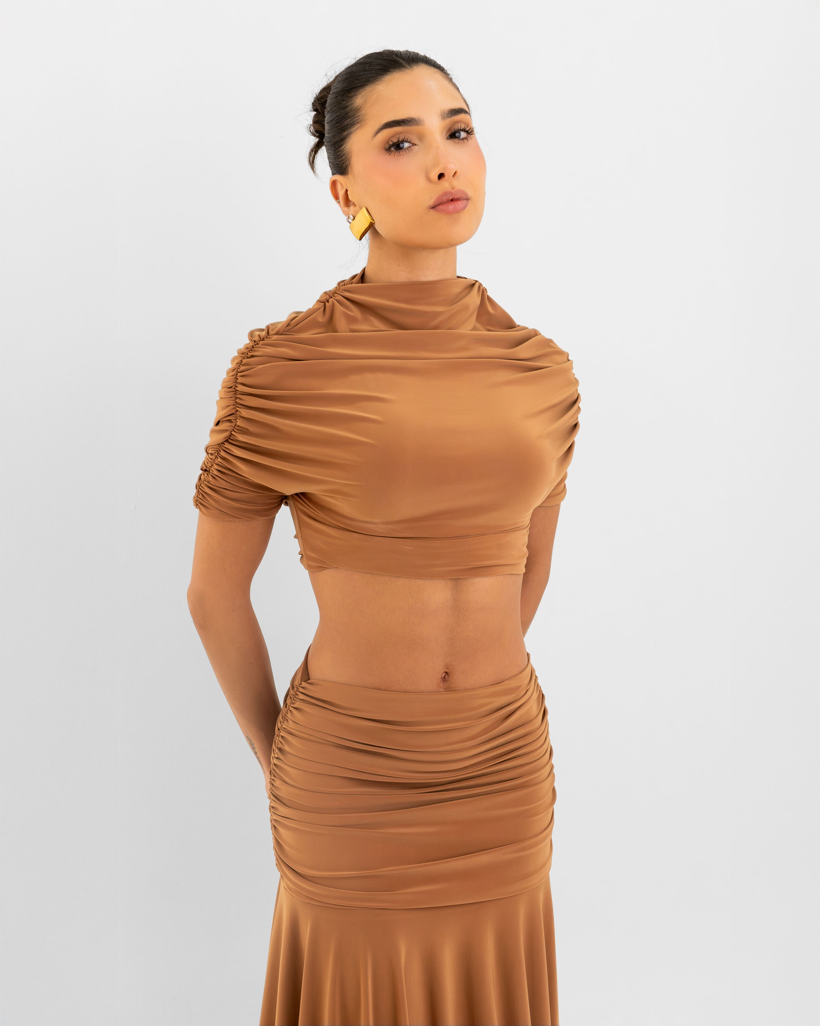 - Short top made from stretch fabric with a draped effect.