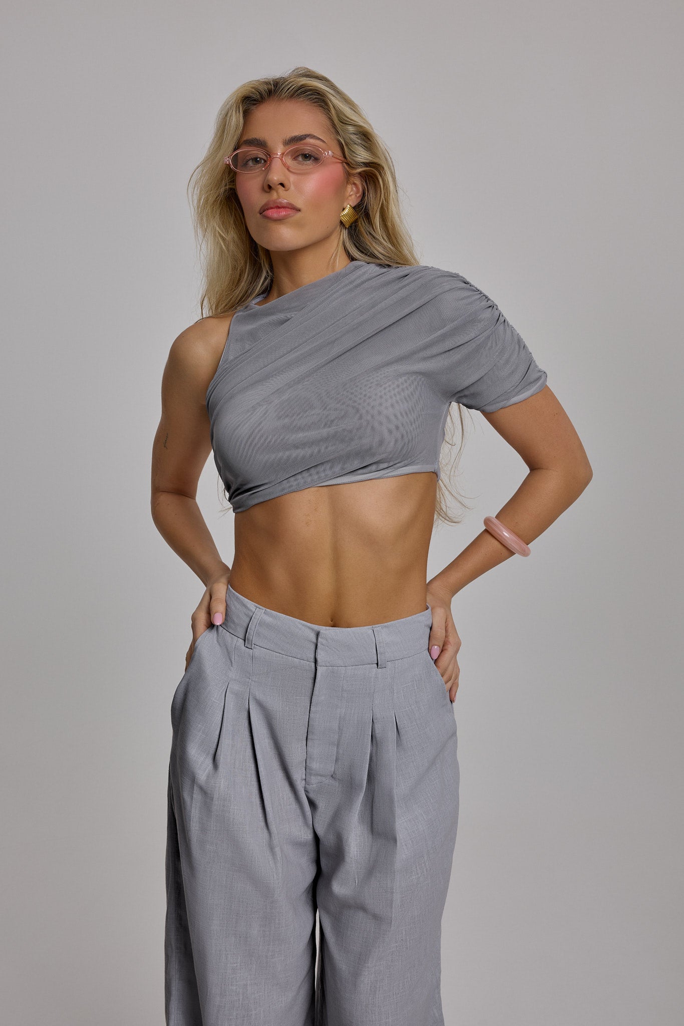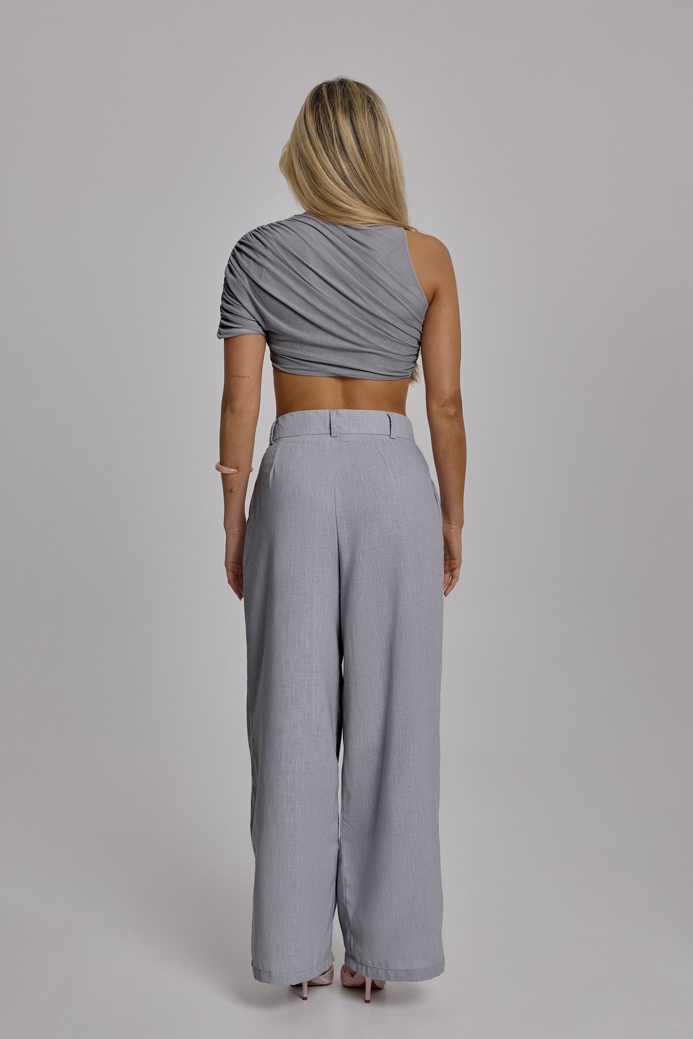 Asymmetrical one-shoulder blouse featuring a wrap-style drape and pleated texture that creates a sophisticated effect. Fitted silhouette that enhances the figure, with a crossed design that adds movement.