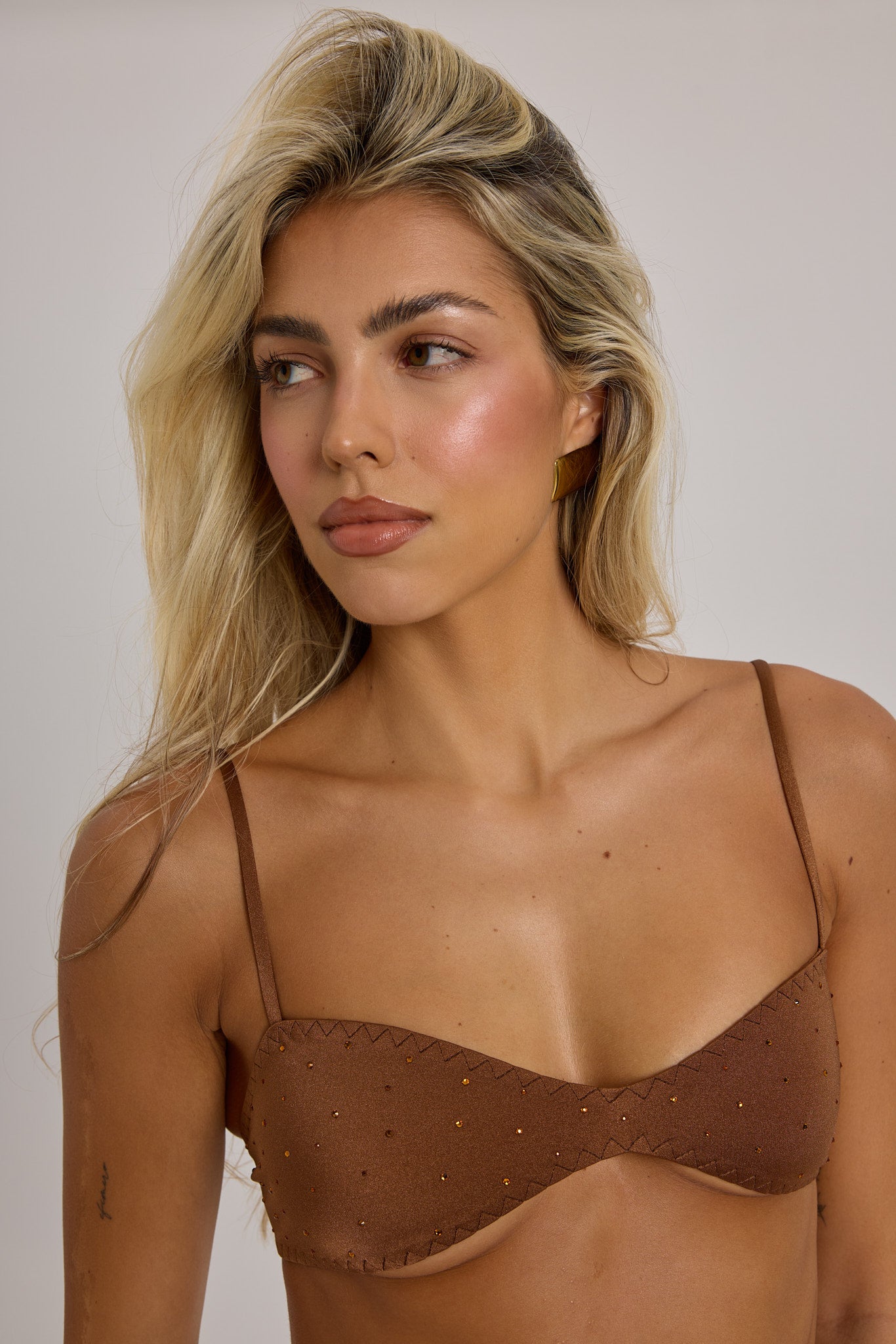 • Medium-Coverage Elongated Adjustable Top with Reinforced Seams, Thin Tie Straps for a Personalized Fit, and Crystal Details