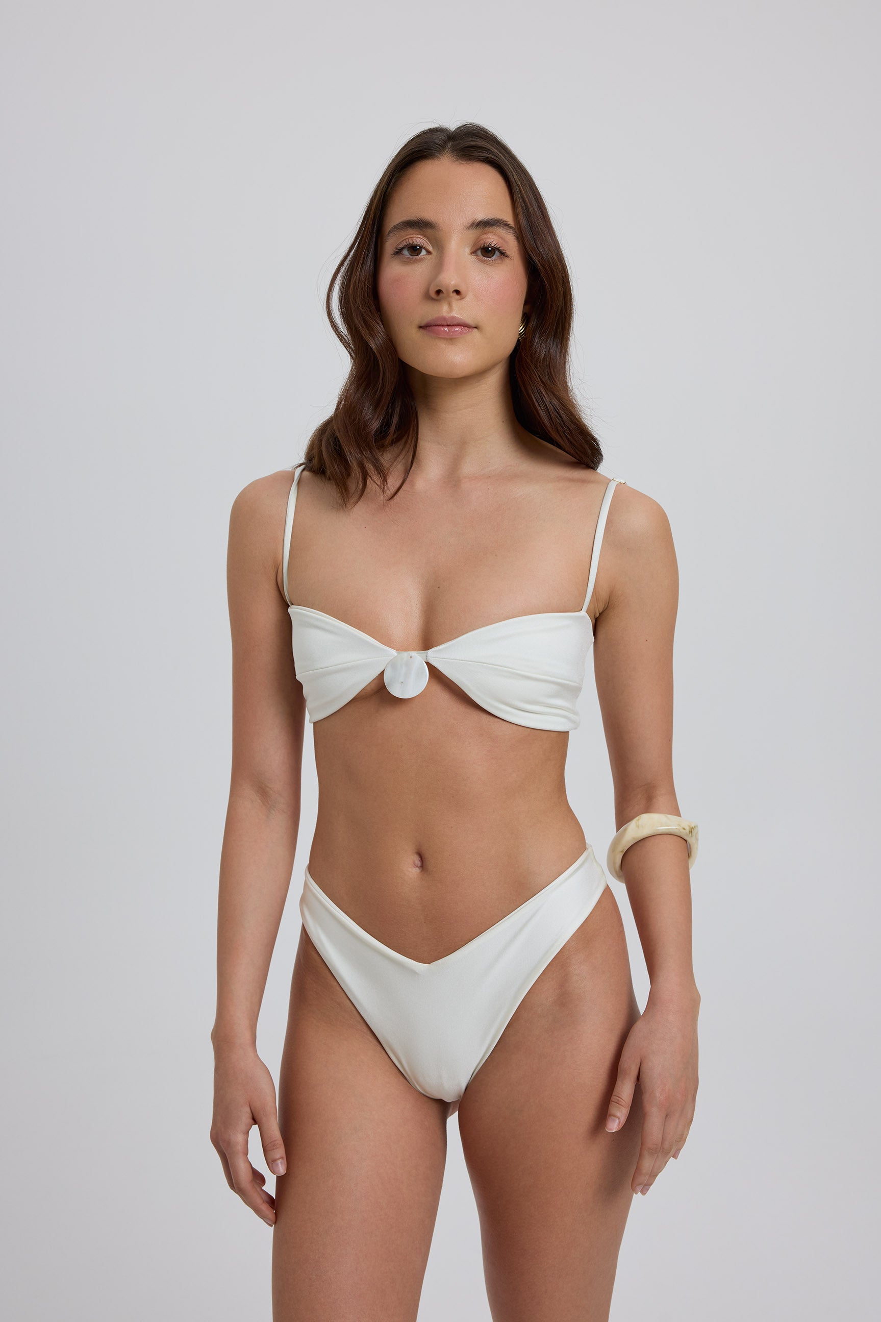 Medium coverage top with back tie and adjustable shoulder straps. Features embossed trim detail.